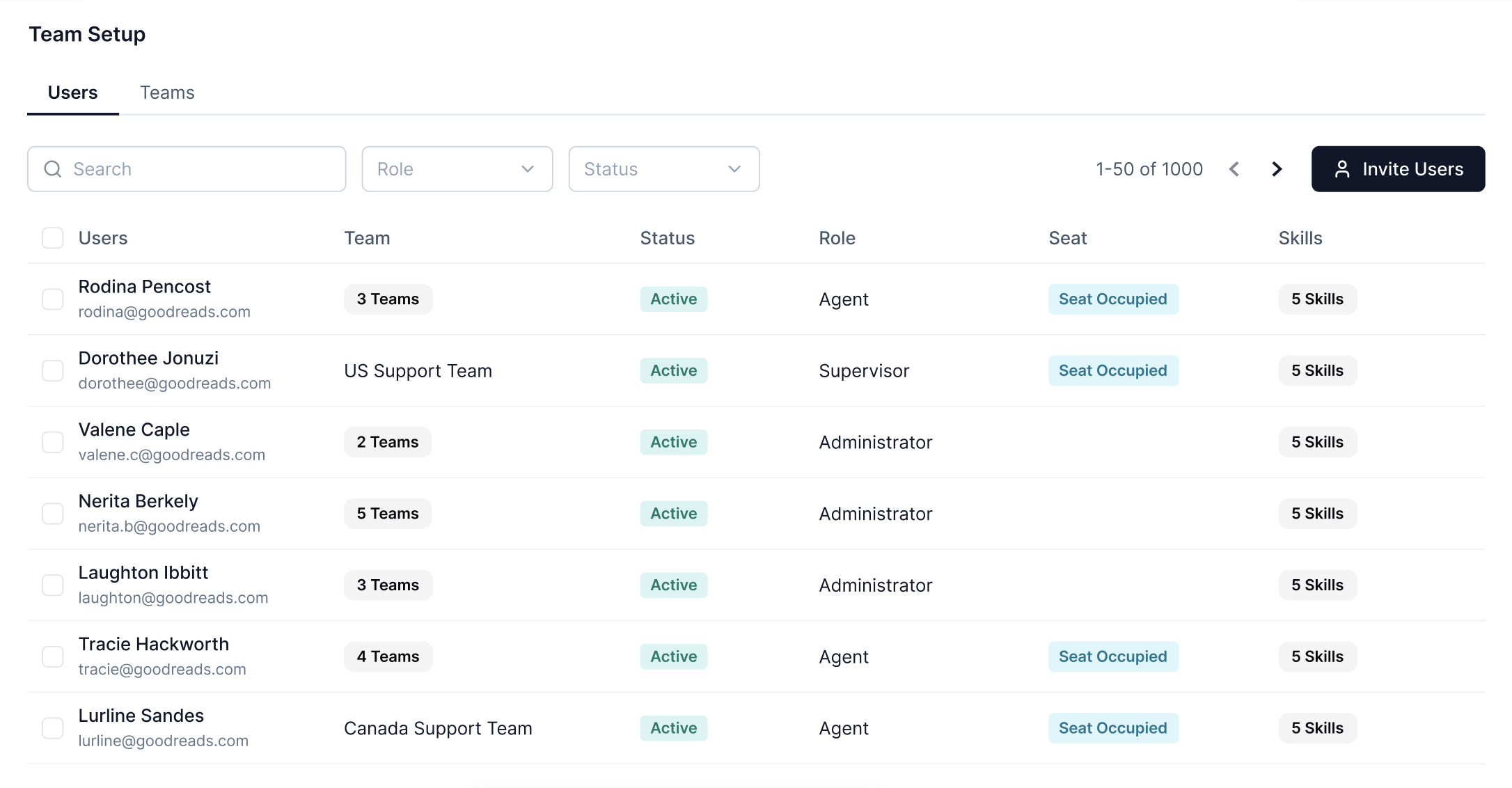 - Invite new users: Add new users to the system by entering their email address, assigning a role (like Agent, Administrator, etc.), and determining the teams they will belong to. You can also assign them specific skills based on your needs.