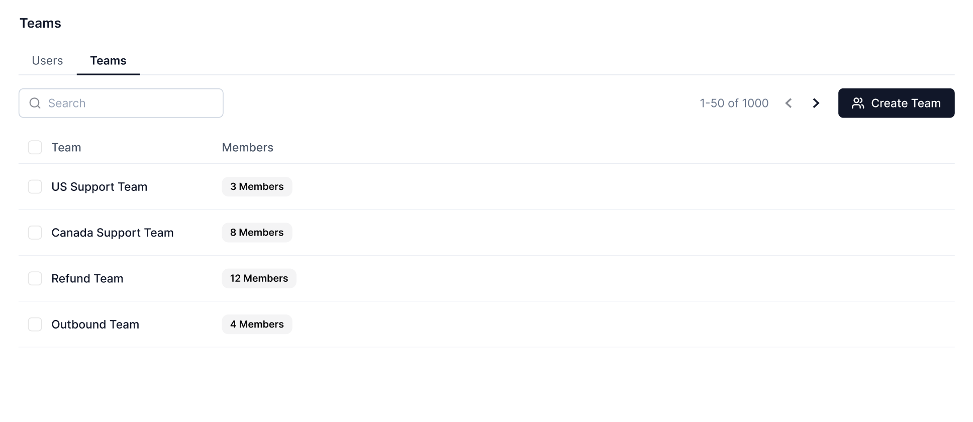 - Create new teams: Create new teams by assigning a name and selecting the members from the existing users. This can help you create specialized groups within your organization.