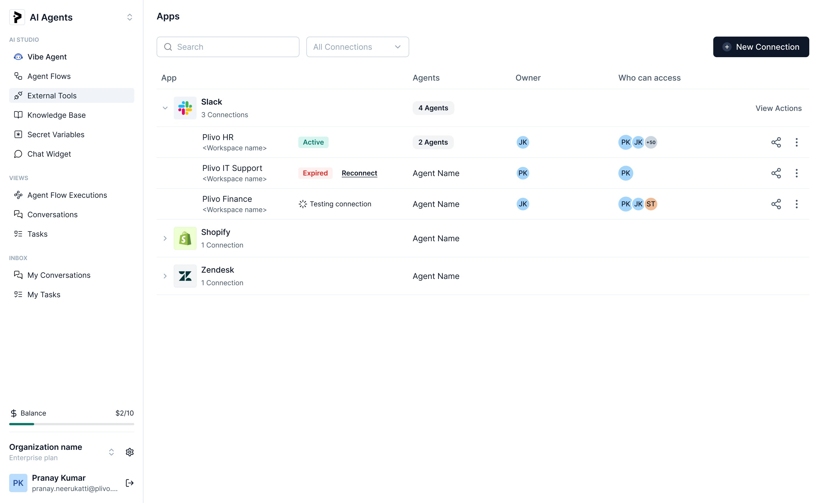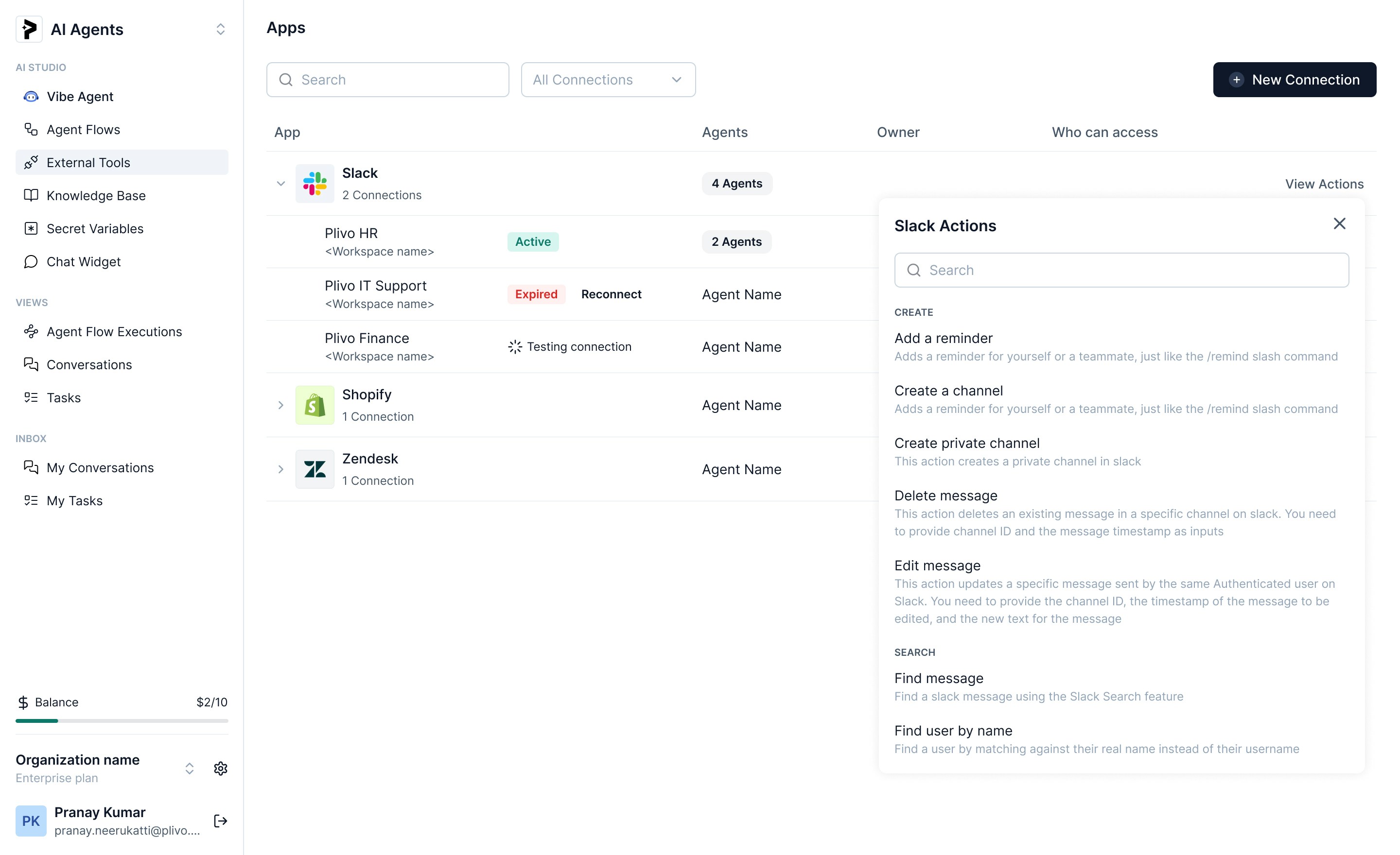 After connecting your application, actions from the app can be used as nodes in the workflow builder. For example, with Slack integration, you could set up an action like send a message or create a channel directly from your agent’s flow.Supported Applications