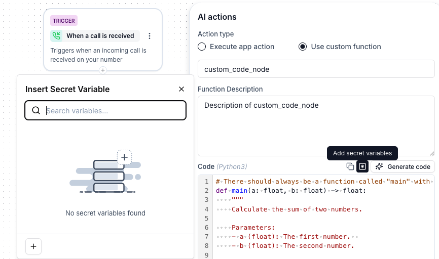 Secret Variables can be inserted into nodes like Custom Code and HTTP Request to securely access sensitive information. Here’s how you use them:- In nodes that support secret variables (like Custom Code or HTTP Request), you will see an Insert Secret Variable option.