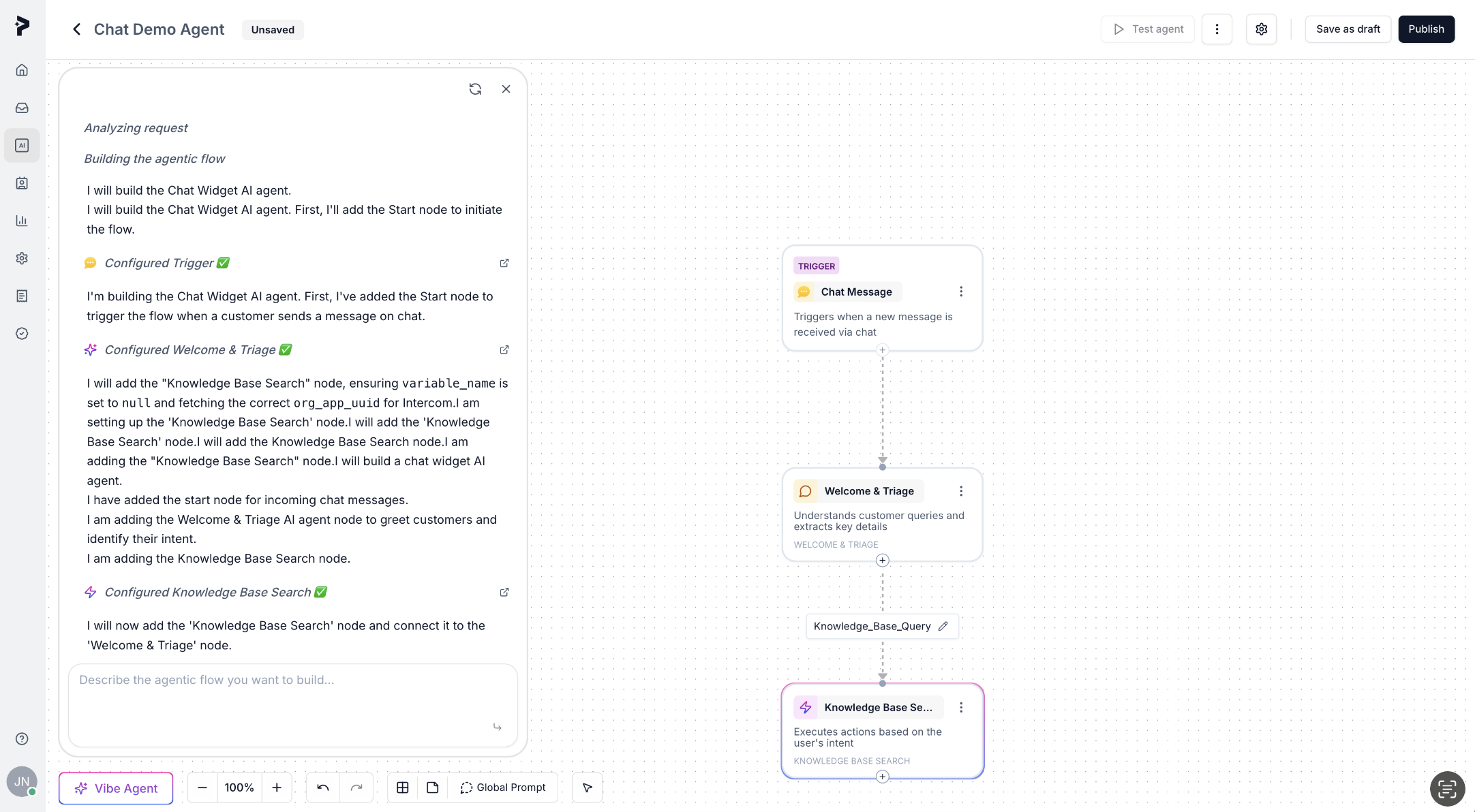 Allow Vibe Agent to place nodes in the agent flow builder. It will automatically generate the flow based on the prompts you’ve provided. Be patient and let it complete the flow. During this phase, you may be asked to authenticate third-party integrations, such as Zendesk.