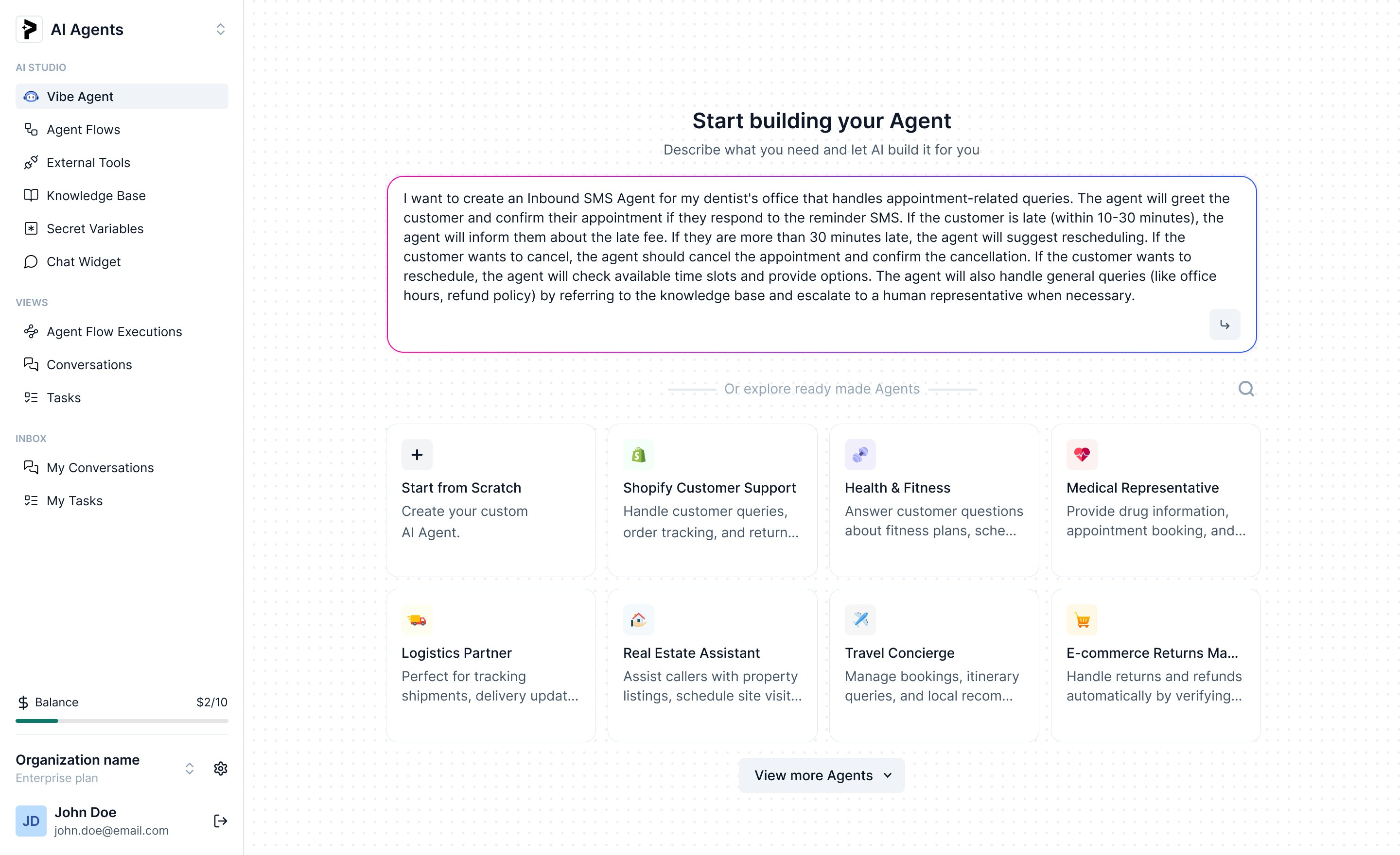 I want to create an Inbound SMS Agent for my dentist’s office that handles appointment-related queries. The agent will greet the customer and confirm their appointment if they respond to the reminder SMS. If the customer is late (within 10-30 minutes), the agent will inform them about the late fee. If they are more than 30 minutes late, the agent will suggest rescheduling. If the customer wants to cancel, the agent should cancel the appointment and confirm the cancellation. If the customer wants to reschedule, the agent will check available time slots and provide options. The agent will also handle general queries (like office hours, refund policy) by referring to the knowledge base and escalate to a human representative when necessary.