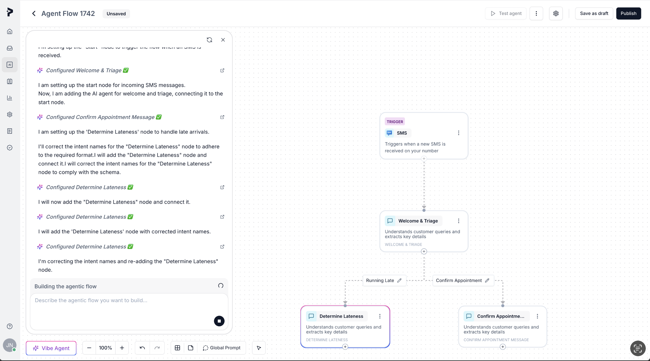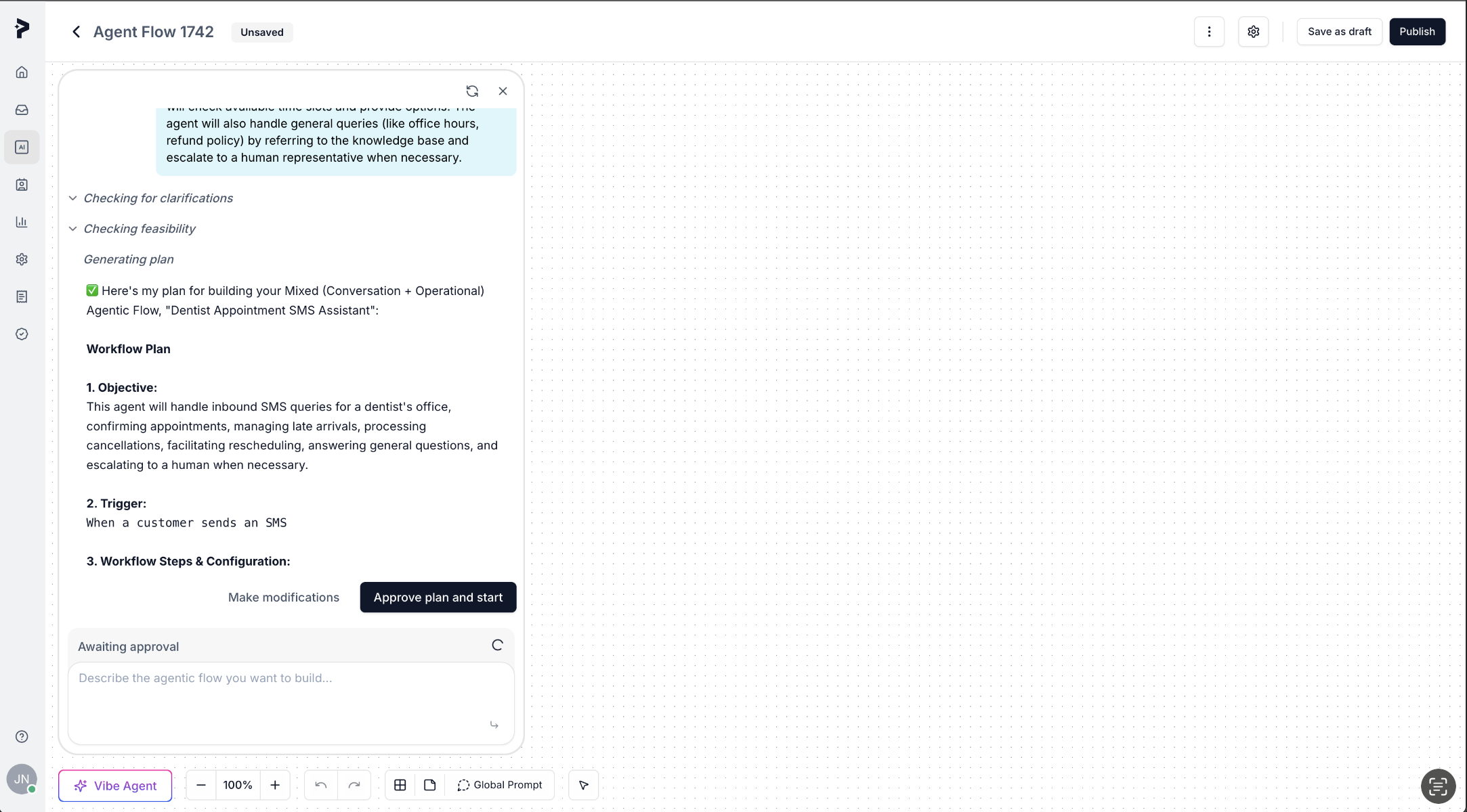 Allow Vibe Agent to place nodes in the agent flow builder. It will automatically generate the flow based on the prompts you’ve provided. Be patient and let it complete the flow. Occasionally, you might need to manually intervene (e.g., authorizing third-party applications for tool calls like Calendar).