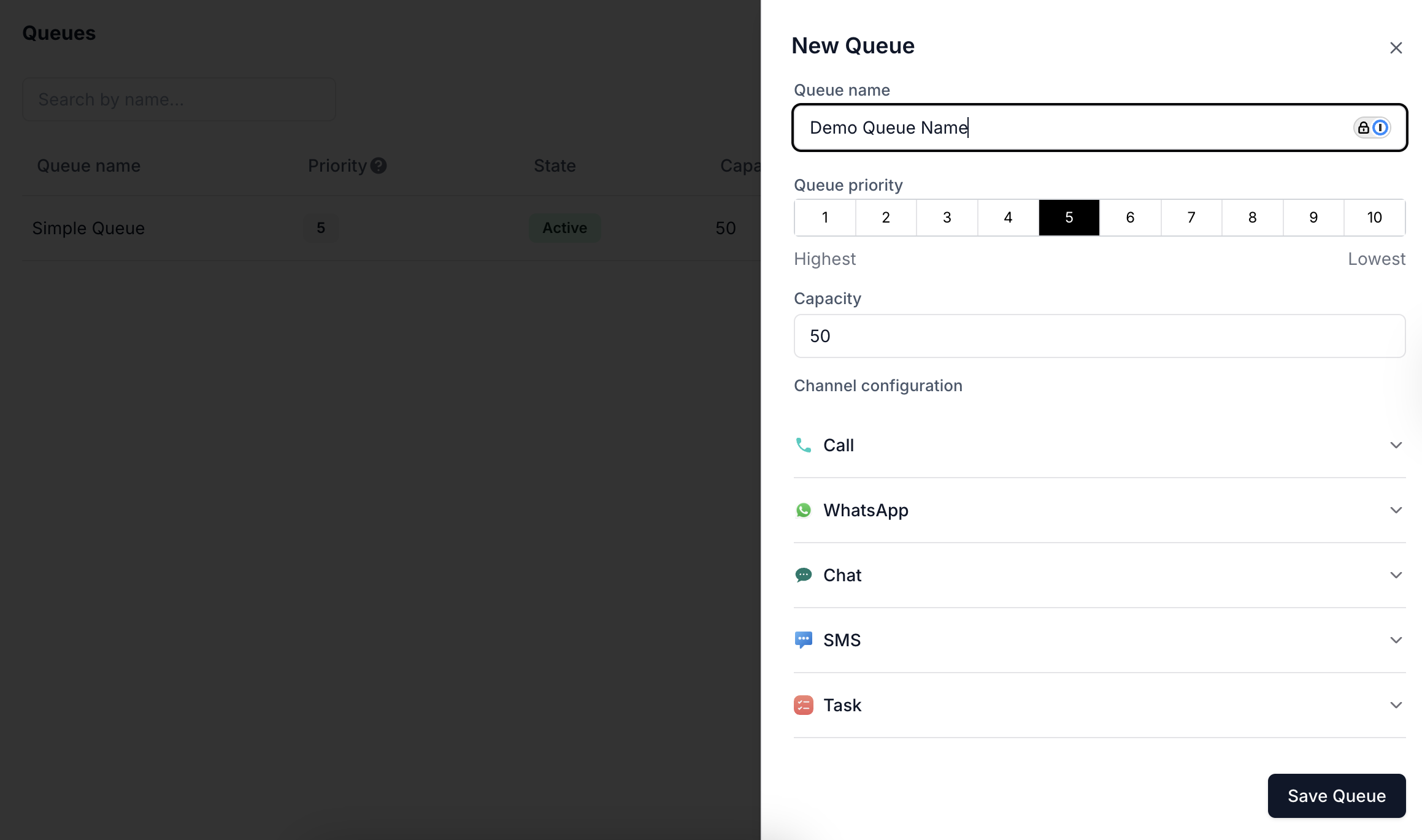 - Capacity: Maximum number of concurrent conversations or tasks the queue can hold. Helps prevent agent overload.