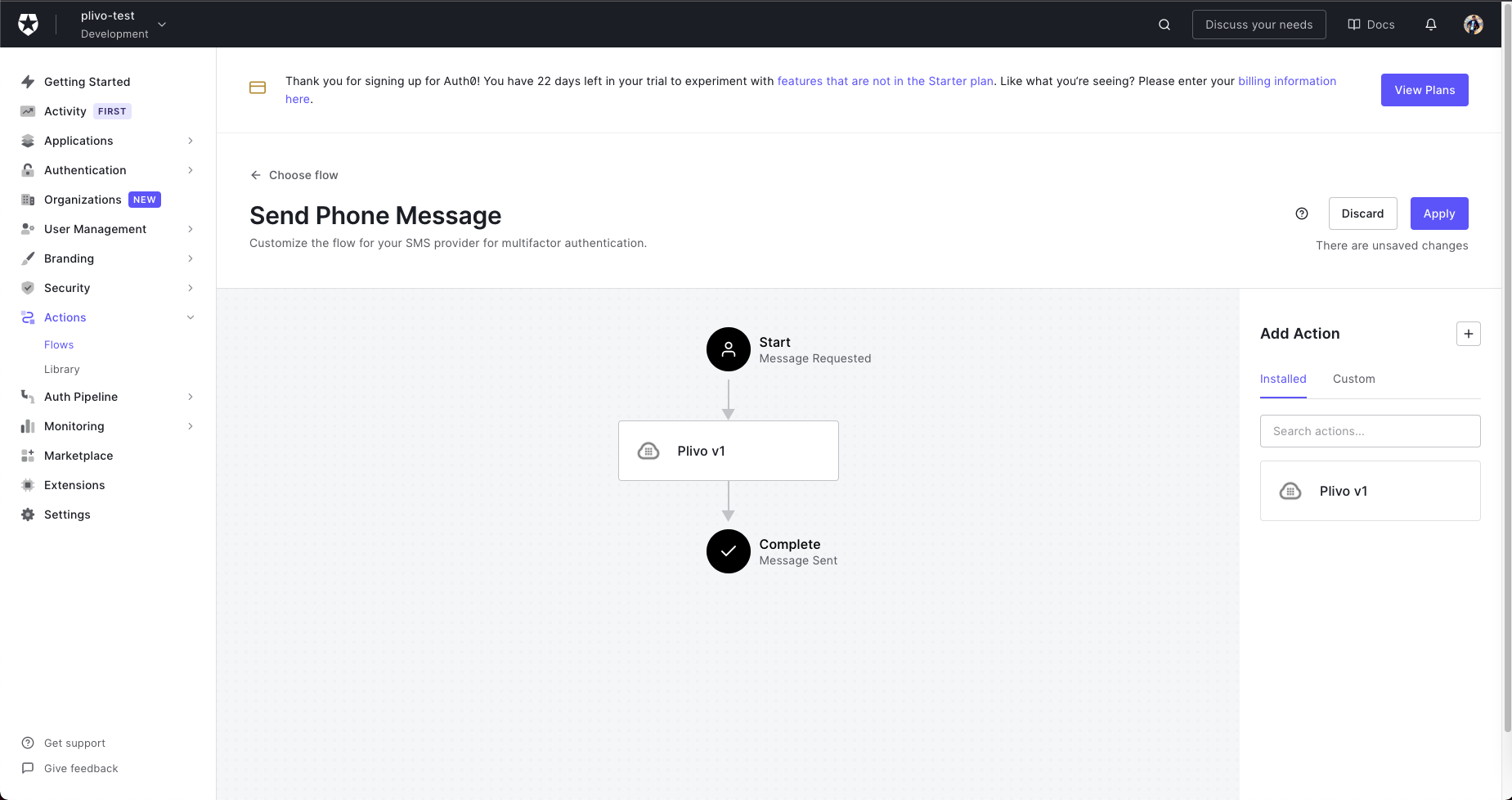 - Click Apply Changes. Now this flow will use the Plivo integration to send an SMS message whenever it’s called.