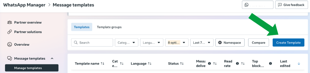 - Go to your Meta Business Profile > WhatsApp Manager > Manage Templates > Create Template