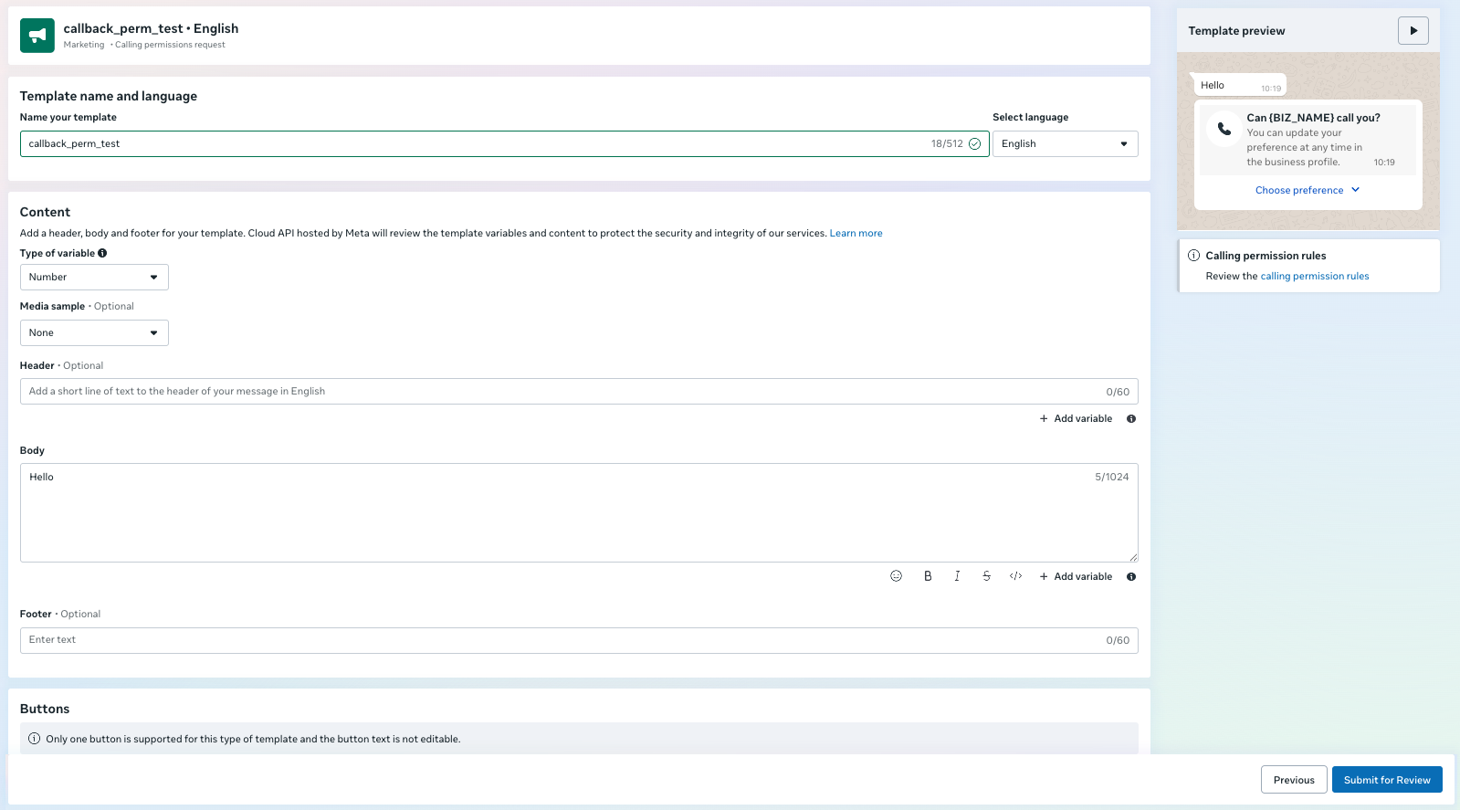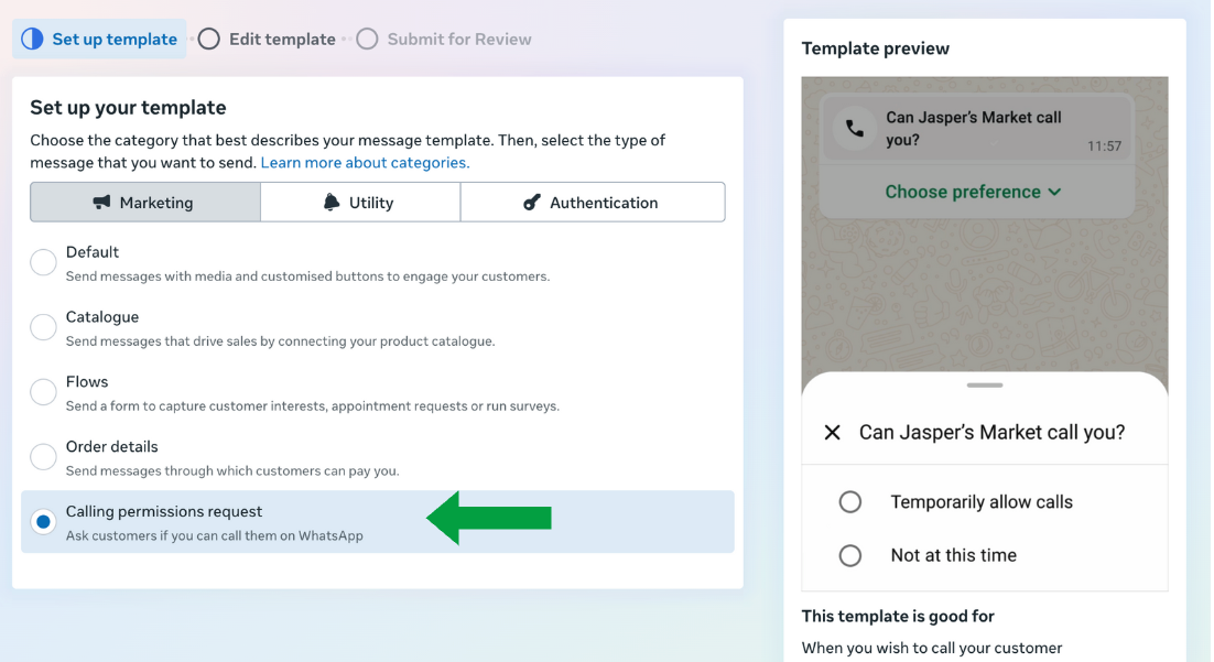 - Select the Calling permissions request under Marketing or Utility