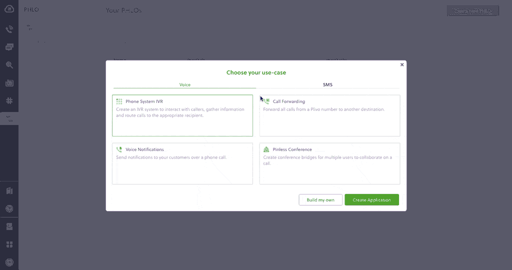 To receive incoming text messages, you must have an SMS-enabled Plivo phone number. You can rent numbers from the Numbers page of the Plivo console, or by using the Numbers API.Create the PHLO