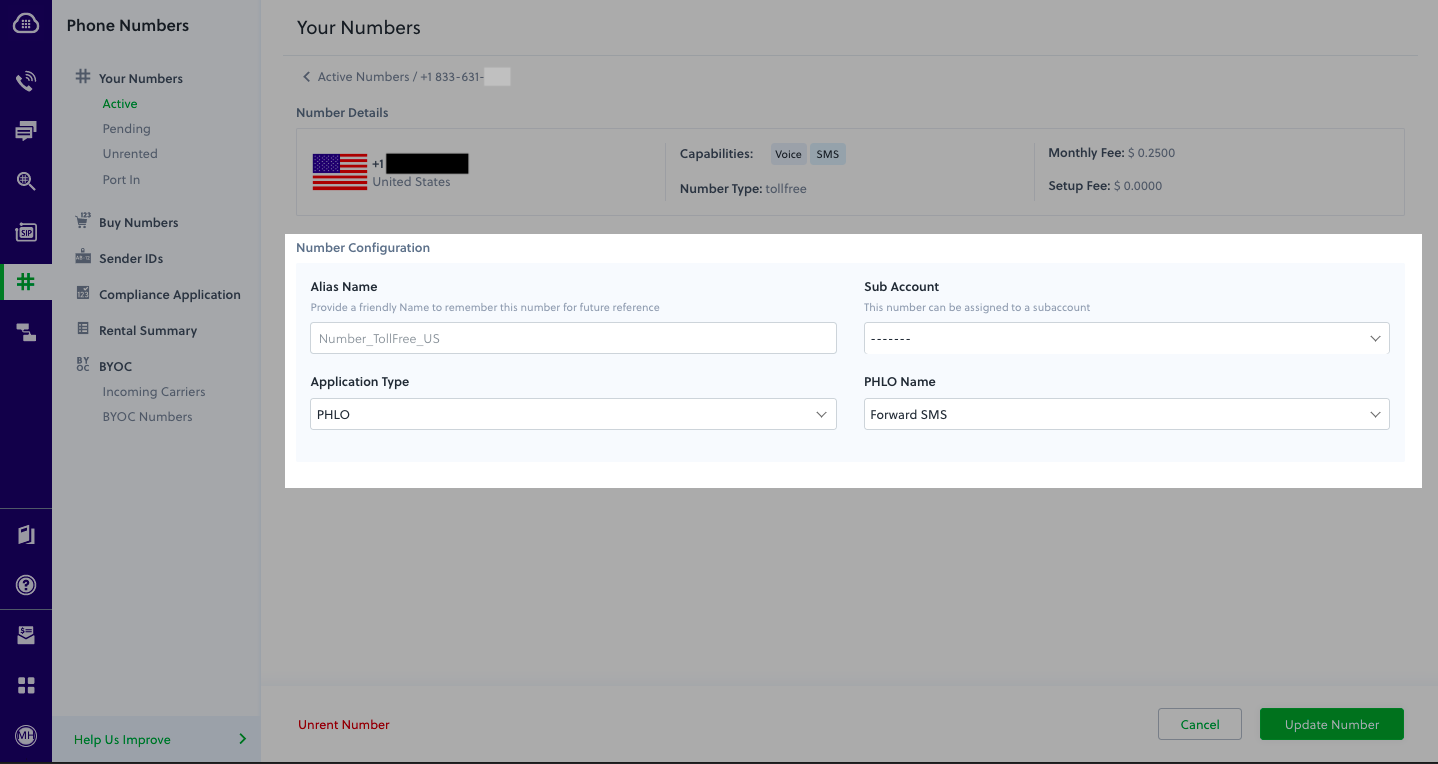 - From the PHLO Name drop-down, select the PHLO you want to use with the phone number, then click Update Number.