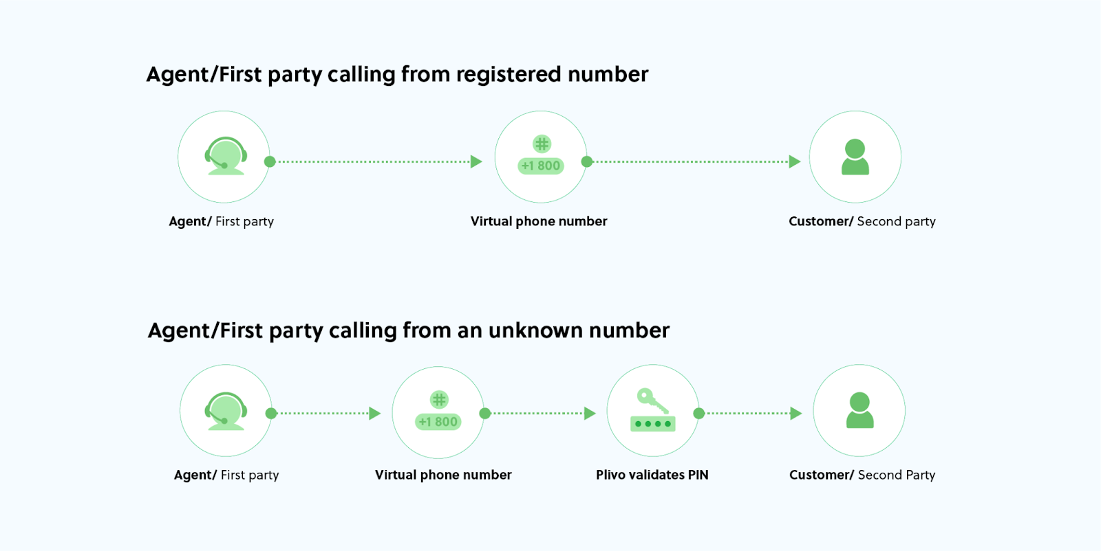 - If either party dials the virtual phone number from an unknown number, they will be prompted to enter the PIN. Once the authentication is successful, they will be connected.