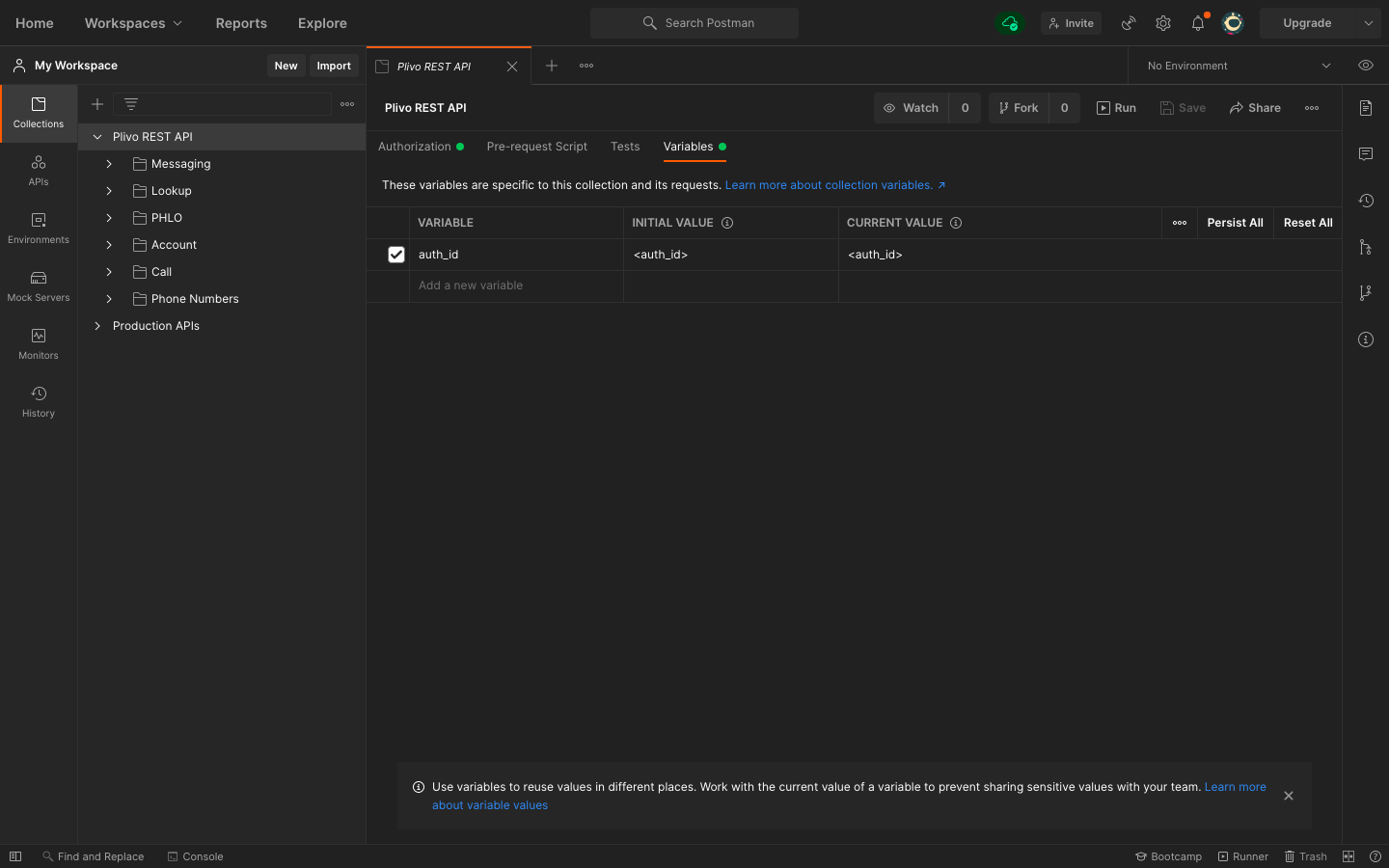 - Once you’ve done that, you can access your Auth ID by writing auth_id within your Postman collection. We’ve already done that for you for all the APIs in the Plivo collection.