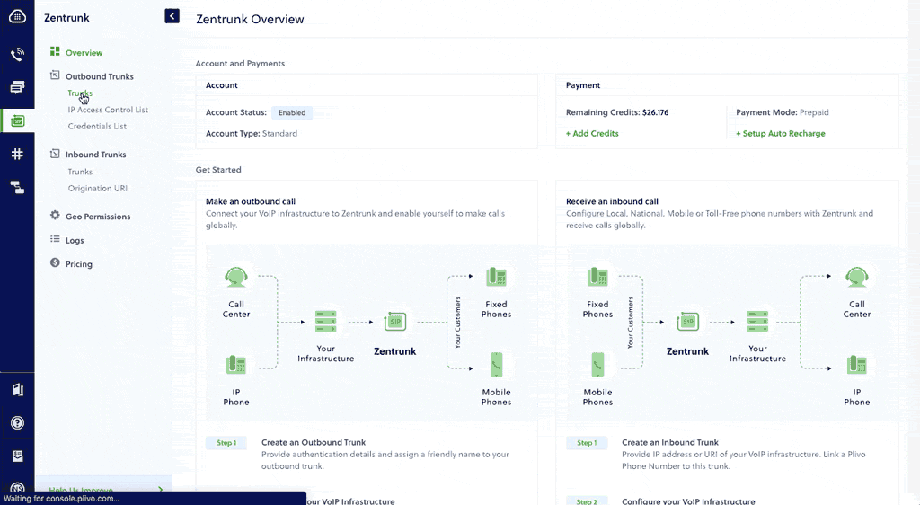 Zentrunk provides benefits such as: Scalability: Zentrunk supports your organization’s growth across multiple geographic locations. By combining voice and data in a single network, SIP trunking lets your organization quickly open new sites or establish full-time remote workers. You can scale as you grow by self-provisioning local, international, mobile, and toll-free numbers in more than 70 countries, configuring them in your trunk, and terminating calls from your IP PBX. You can also make calls to more than 190 countries using Zentrunk to make your business more globally accessible. Cost savings: With traditional phone service, your organization is subject to different, often variable charges for your local, long distance, and international calling. Moving from traditional telecom systems to SIP trunking helps you save on recurring costs, as you can build your entire telecom system in the cloud, and be billed on a simple per-usage basis. You can also save by forgoing the physical infrastructure and hardware investments that typically come with scaling phone lines. With Zentrunk, adding phone lines or services is as simple as purchasing an additional handset and scaling your monthly service agreement. Reliability: Traditional phone systems are prone to interruptions from factors such as weather events and networking issues. SIP trunking is more reliable, since you can add failover routing if a primary IP address is not responsive. With a redundant infrastructure across multiple geographies and at least three local carrier connections across countries, Zentrunk promises 99.99% uptime. Easy management for your IT teams: Your IT team will never have to wait on hold to speak to a customer service representative again. SIP trunking and VoIP phones offer easy-to-use administrative portals for on-site management, including actions like adjusting call routing, changing extensions, and adding phone lines on demand. Plivo’s 24x7 premium support and consultative customer success team can provide you with technical guidance when you need it.Getting started