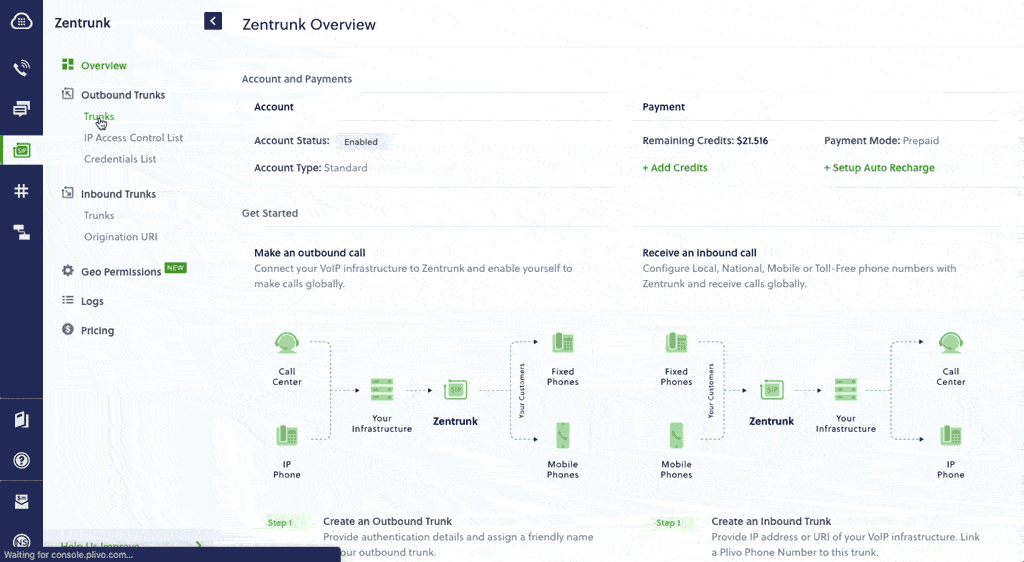 You need to set up the trunk authentication on the Plivo Console to use Zentrunk to terminate calls. Authentication of your trunk ensures that Zentrunk only accepts traffic that your infrastructure sends securely. You can configure your trunk to be authenticated by an IP Access Control List, a Credentials List, or both. For more information, please check the step-by-step GIF & instructions below.