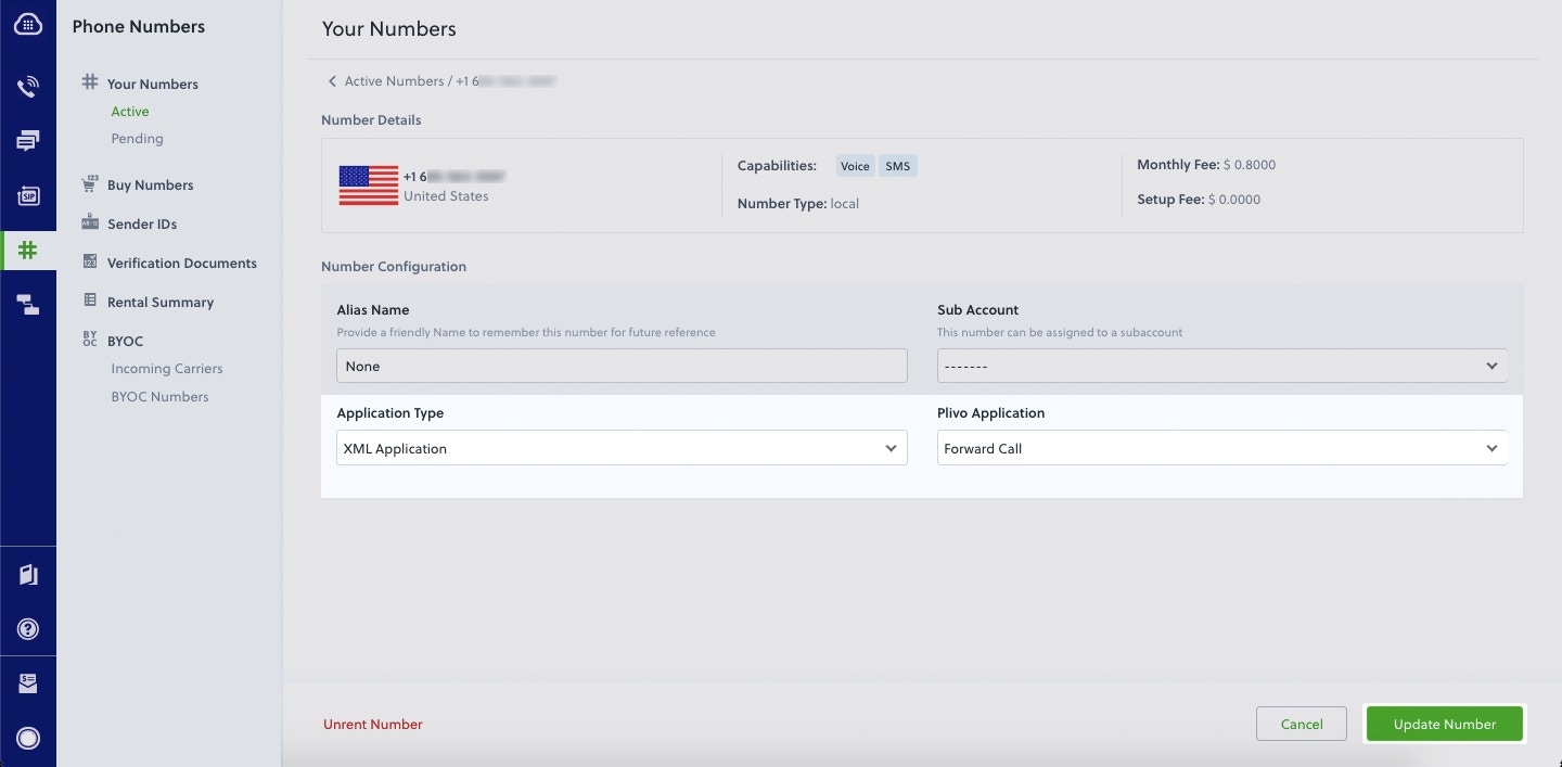 Navigate to the Numbers page and select the phone number you want to use for this application.From the Application Type drop-down, selectXML Application.From the Plivo Application drop-down, select Forward Call (the name we gave the application).Click Update Number to save.