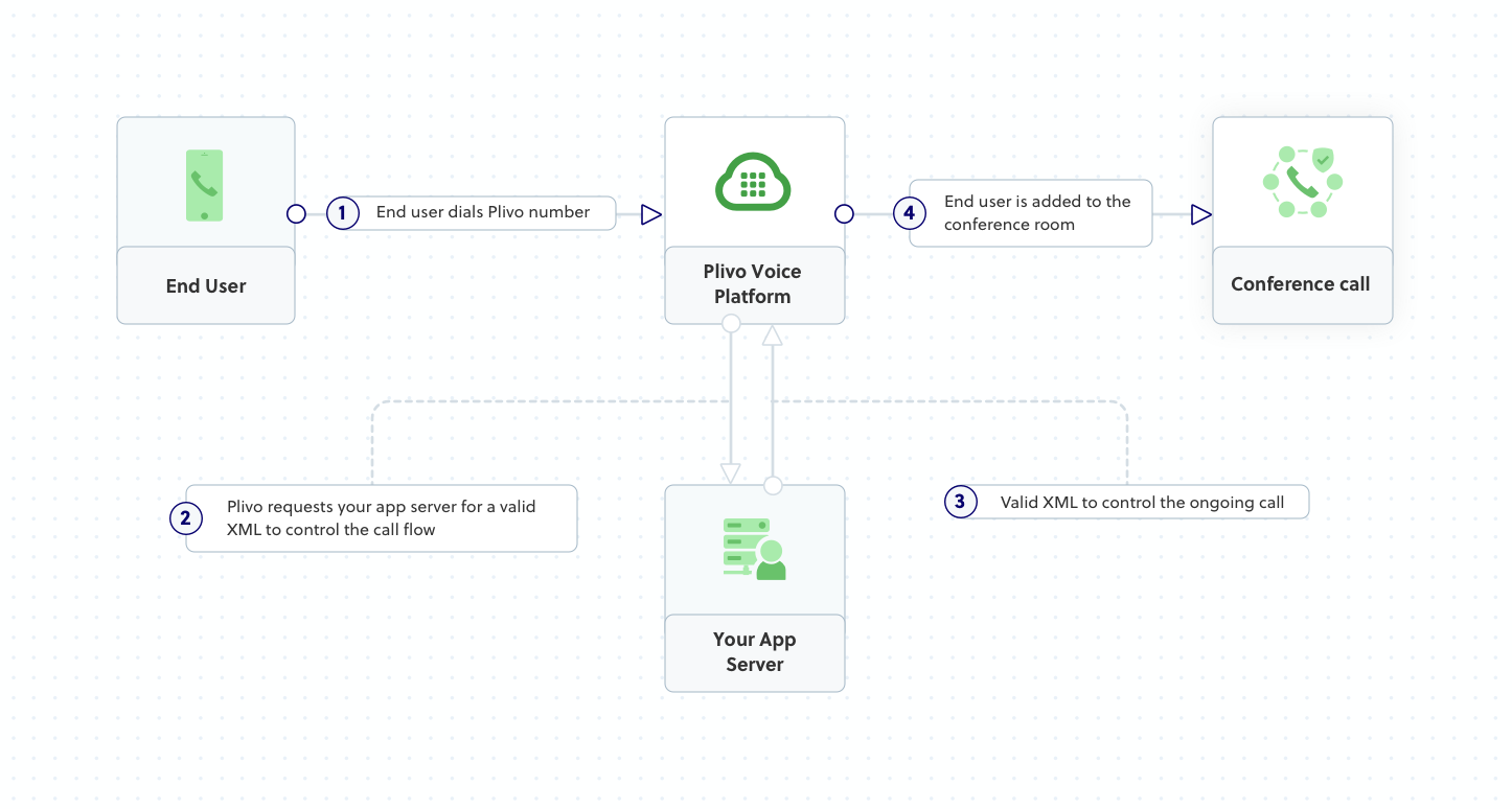This guide shows how to create and configure conference calls with a PIN to let multiple people securely connect to a single call. Only participants who have a specified passcode can enter the conference call.You can make conference calls either by using our PHLO visual workflow builder or our APIs and XML documents. Follow the instructions in one of the tabs below.