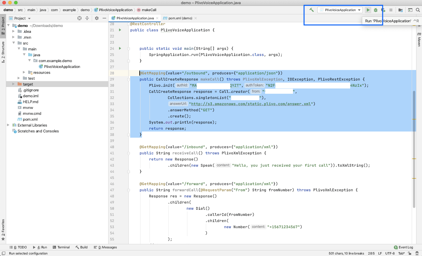Edit the PlivoVoiceApplication.java file in the src/main/java/com.example.demo/ folder and paste into it this code.Note: Here, the demo application name is PlivoVoiceApplication.java because we provided the friendly name